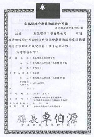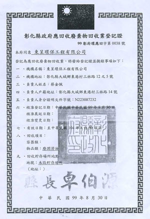 東呈環保工程有限公司成立至今已有20年的歷史,是專門處理各類廢油回收的廠商,我們具有環保署認證,並擁有乙級清理執照及合法的營業登記證,一路走來,秉持著誠信、迅速、服務,深得各企業的長期合作。